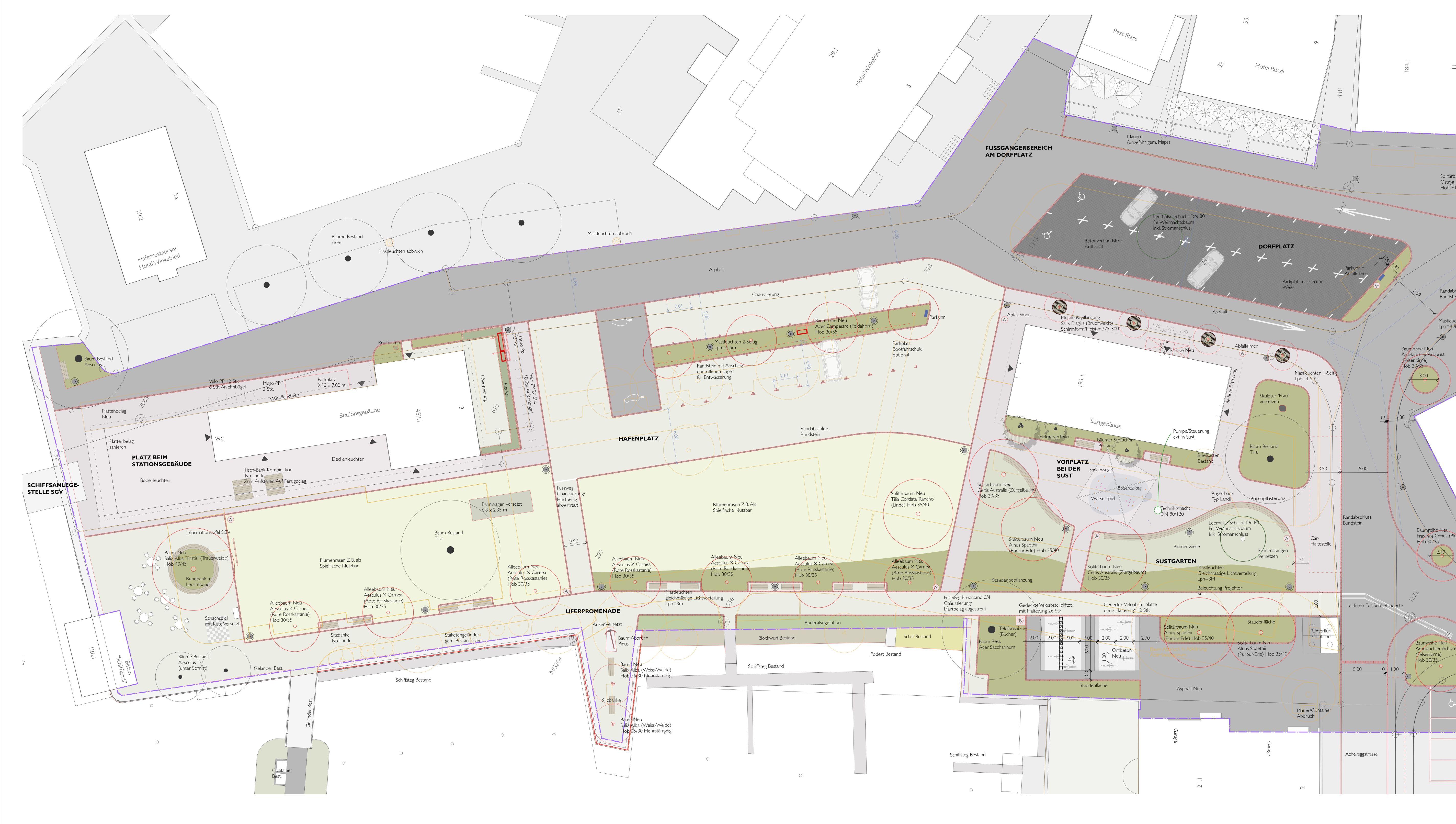 Komplette Neugestaltung der öffentlichen Anlagen und Infrastrukturen wie Leitungen, Strassen- und Platzbeleuchtung des Dorfzentrums von Stansstad mit Integration Wasserspiel und E-Ladestation.